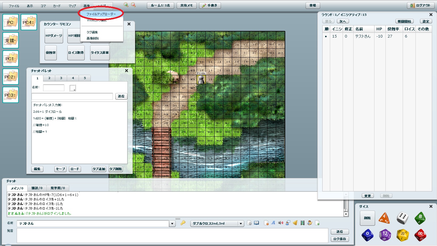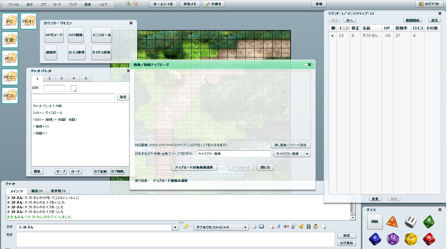 PC情報、支援バッドステータスの状況、情報ハンドアウトなどを全員が参照できます。 新しい項目を追加する場合は、画面上部の「画面メモ」ボタンを押下してください。